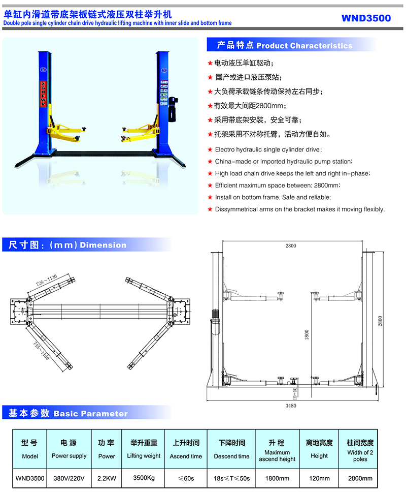 WND3500單缸內(nèi)滑道帶底架板鏈?zhǔn)揭簤弘p柱舉升機(jī)