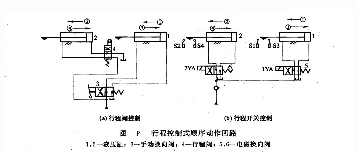 行程控制式是利用液壓缸移動(dòng)到某一規(guī)定位置后,發(fā)出控制信號(hào),使下一個(gè)液壓缸動(dòng)作的控制方式。這種控制方式應(yīng)用非常普遍,它可由行程閥、電氣行程開(kāi)關(guān)或特殊結(jié)構(gòu)的液壓缸等實(shí)現(xiàn)。