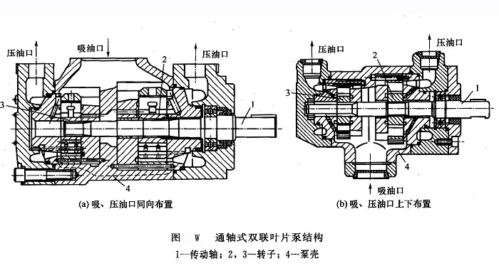 ⑤雙聯(lián)葉片泵幾乎所有形式的單葉片泵都可以組合成為雙聯(lián)泵結(jié)構(gòu),但組合形式又有所區(qū)別。常見的結(jié)構(gòu)組合形式有通軸式和法蘭式兩種。圖W所示為通軸式雙聯(lián)葉片泵結(jié)構(gòu)。在一個(gè)泵殼4內(nèi)的一根傳動(dòng)軸l的兩端,分別裝有兩個(gè)轉(zhuǎn)子2和3,形成排量不同的大小泵且兩者共用一個(gè)吸油口,但壓油口分開[圖W(a)的吸、壓油口均布置在泵殼的上方;而圖W(b)的吸油口布置在泵殼的下方,壓油口布置在泵殼的上方]。法蘭式是將兩臺(tái)獨(dú)立單泵通過連接法蘭直接組合成雙聯(lián)泵。