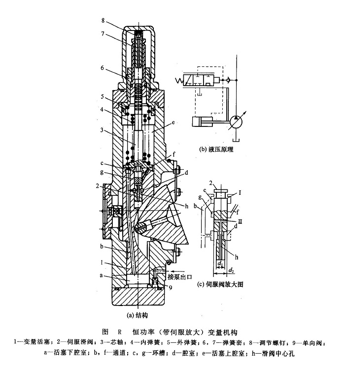 圖R(a)為一種恒功率(帶伺服放大)變量泵的變量機(jī)構(gòu)。伺服滑閥2裝在變量活塞1內(nèi),故伺服滑閥和變量活塞構(gòu)成直接的位置反饋關(guān)系。來(lái)自泵出口的高壓油通過(guò)單向閥9進(jìn)入變量活塞下腔室a,并通過(guò)變量活塞中的孔道b引至滑閥的d腔和c腔 [圖R(c)]??刂苹钊?span lang="EN-US">d腔的承壓面積為(π/4)(d 2 2-d 22),此承壓面積上的液壓力與伺服滑閥上的彈簧力相平衡。如液壓力大于彈簧力,則滑閥上移,變量活塞上腔的油液通過(guò)孔道f再經(jīng)被打開的控制閥口及中心孔h至回油腔,因而活塞上腔壓力下降。當(dāng)變量活塞上腔壓力下降到pl≤p(A2/A1)時(shí)(A1、A2分別為變量活塞上、下端面承壓面積),變量活塞上移,并推動(dòng)變量機(jī)構(gòu)使泵變量。