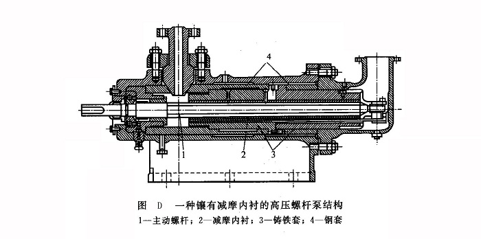 螺桿泵的殼體均由灰口鑄鐵或球墨鑄鐵制成。低壓螺桿泵的襯套可用球墨鑄鐵、耐磨鑄鐵或錫青銅制造,高壓螺桿泵的襯套則要用鑄鋼制成并鑲有軸承合金減摩內(nèi)襯(圖D)。