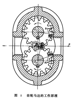 (1)工作原理 齒輪馬達(dá)的工作原理如圖A所示。圖中P點(diǎn)為兩齒輪的嚙合點(diǎn)。設(shè)齒輪的齒高為h,嚙合點(diǎn)P到兩齒根的距離分別為a和b。由于a和b都小于h,所以當(dāng)壓力油作用到齒面上時(shí)(如圖中箭頭所示,齒面上兩邊受力平衡部分都未用箭頭表示),在兩個(gè)齒輪上就各有一個(gè)使它們產(chǎn)生轉(zhuǎn)矩的作用力:其中作用在下齒輪的力為pB (h-a);作用在上齒輪的力為pB (h-b),p為輸入油液壓力,B為齒寬。在上述力的作用下,兩齒輪按圖示方向回轉(zhuǎn),并把液壓油帶到低壓腔隨著輪齒的嚙合而排出,同時(shí)在液壓馬達(dá)的輸出軸上輸出一定的轉(zhuǎn)矩和轉(zhuǎn)速。