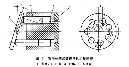 (1)工作原理柱塞式高速馬達(dá)一般都是軸向式,圖C所示為其工作原理。斜盤1和配油盤4固定不動(dòng),缸體3及其上的柱塞2可繞缸體的水平軸線旋轉(zhuǎn)。當(dāng)壓力油經(jīng)配油盤通入缸孔進(jìn)入柱塞底部時(shí),柱塞受油壓作用而向外頂出,緊緊壓在斜盤面上,這時(shí)斜盤對(duì)柱塞的反作用力為F。由于斜盤有一傾斜角γ,所以F可分解為兩個(gè)分力;一個(gè)是軸向分力Fx,平行于柱塞軸線,并與柱塞底部油壓力平衡;另一個(gè)分力是Fy,垂直于柱塞軸線。它們的計(jì)算值分別為