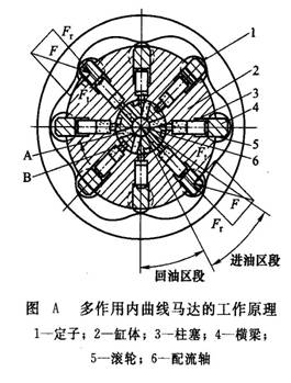 定子1的內表面由x段形狀相同作均勻分布的曲面組成,曲面的數目x就是馬達的作用次數(本例X=6)。每一曲面的凹部的頂點處分為對稱的兩半,一半為進油區(qū)段(即工作區(qū)段),另一半為回油區(qū)段。缸體2有z個(本例為8個)徑向柱塞孔沿圓周均布,柱塞孔中裝有柱塞3。柱塞頭部與橫梁4接觸,橫梁可在缸體的徑向槽中滑動。安裝在橫梁兩端軸頸上的滾輪5可沿定子內表面滾動。在缸體內,每個柱塞孔底部都有一配流孔與配流軸6相通。配流軸是固定不動的,其上有2x個配流窗孔沿圓周均勻分布,其中有x個窗孔A與軸中心的進油孔相通,另外x個窗孔 B與回油孔道相通,2x個配流窗孔位置又分別和定子內表面的進、回油區(qū)段位置一一相對應。