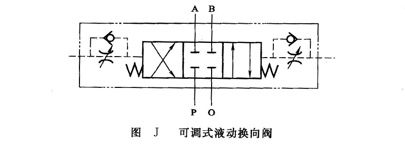 液壓操縱可給予閥芯很大的推力,因此液動(dòng)換向閥適用于壓力高、流量大、閥芯移動(dòng)行程長(zhǎng)的場(chǎng)合。在液動(dòng)換向閥的控制油路上往往裝有可調(diào)的單向節(jié)流閥(稱(chēng)阻尼器),以便分別調(diào)節(jié)換向閥芯在兩個(gè)方向上的運(yùn)動(dòng)速度,改善換向性能。阻尼器和液動(dòng)換向閥可連成一體也可獨(dú)立。帶阻尼器的液動(dòng)換向閥職能符號(hào)如圖J所示。