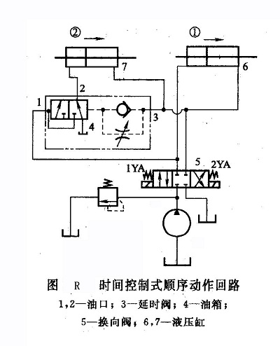 時(shí)間控制式就是在一個(gè)液壓缸開(kāi)始動(dòng)作后,經(jīng)過(guò)一段規(guī)定的時(shí)間,另一個(gè)液壓缸動(dòng)作的控制方式。在液壓系統(tǒng)中,時(shí)間的控制一般是由延時(shí)閥來(lái)完成的。