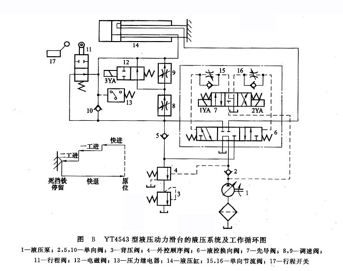 圖B所示為YT4543型液壓動力滑臺的液壓系統及工作循環(huán)圖,該液壓系統采用限壓式變量葉片泵供油,用電液換向閥換向,用行程閥實現快慢速度的轉換,用電磁閥實現兩種工進速度的轉換,用調速閥使進給速度穩(wěn)定。該系統在機械和電氣的配合下,可實現多種自動工作循環(huán),通常實現的工作循環(huán)是;快進→第一次工作進給(一工進)→第二次工作進給(二工進)→死擋鐵停留→快速退回→原位停止。下面就以它為例來說明液壓系統的工作原理。