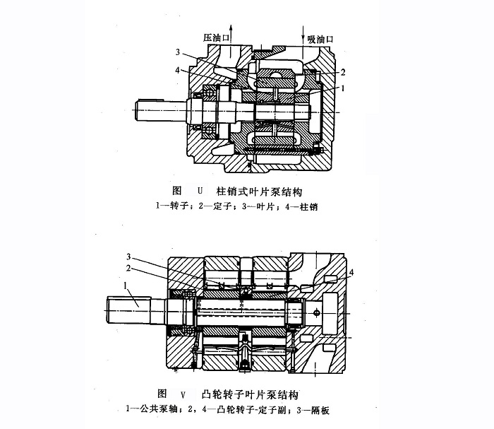 ④凸輪轉(zhuǎn)子葉片泵 圖V所示為凸輪轉(zhuǎn)子葉片泵結(jié)構(gòu)。為了減少輸出流量的脈動(dòng),雙作用泵除凸輪上采用專門的過渡曲面外,由裝于公共泵軸l上的相位相差90°的兩個(gè)凸輪轉(zhuǎn)子一定子副2和4組合而成,兩個(gè)單元悶用隔板3分開,但相通。這樣的泵兩組工作容積互相補(bǔ)償,且又沒有困油現(xiàn)象,流量脈動(dòng)和噪聲都很小。