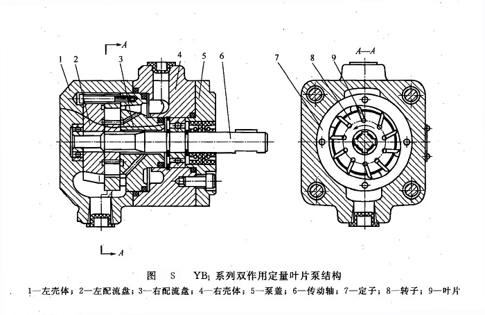 ①YB1系列雙作用定量葉片泵該系列雙作用葉片泵是在我國(guó)最早引進(jìn)前蘇聯(lián)HY02技術(shù)生產(chǎn)的YB1型葉片泵基礎(chǔ)上經(jīng)改進(jìn)設(shè)計(jì)而成的液壓泵,其結(jié)構(gòu)如圖S所示。該系列泵由左殼體1、右殼體4、轉(zhuǎn)子8、葉片9、定子7、左配流盤2、右配流盤3、泵蓋5及傳動(dòng)軸6等構(gòu)件組成。右配油盤上的O形密封圈可有效防止軸端泄漏,密封可靠。泵的左、右配流盤及定子、轉(zhuǎn)子和葉片可先組裝成一個(gè)部件(簡(jiǎn)稱為泵芯)裝入殼體。此組合部件由兩個(gè)緊固螺釘提供初始預(yù)緊力,以便泵啟動(dòng)時(shí)能建立起壓力。建立壓力后,配油盤和定子組件靠右配油盤右側(cè)的液壓力壓緊,壓緊力隨壓力增大而增大,自動(dòng)補(bǔ)償軸向間隙,保證泵有較高的容積效率。YB1系列葉片泵可反轉(zhuǎn),任意兩個(gè)不同排量的單泵可組成雙聯(lián)泵,單、雙聯(lián)泵共有119個(gè)不同規(guī)格,單泵最大排量為100mL/r,額定壓力為7MPa。結(jié)構(gòu)簡(jiǎn)單,壓力脈動(dòng)和噪聲小,壽命長(zhǎng)。YB-D系列葉片泵的結(jié)構(gòu)基本與YB1系列泵相同,只是其定子進(jìn)行了氮化處理,殼體壁厚加大,額定壓力增加到1OMPa。