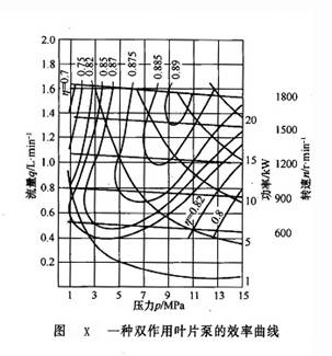 (4)效率 單作用定量葉片泵在額定工況下的容積效率可達(dá)92%;雙作用定量葉片泵在額定工況下的容積效率可超過(guò)94%,均略低于齒輪泵,但葉片泵的機(jī)械效率一般較高。故兩者的總效率相差無(wú)幾。圖X 所示為一種雙作用葉片泵的效率曲線。