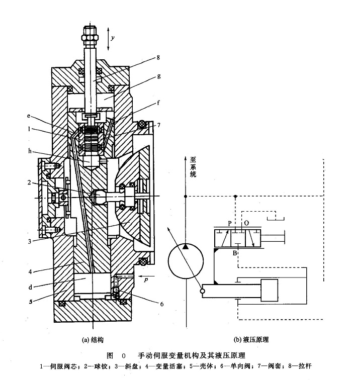 a.手動(dòng)伺服變量機(jī)構(gòu) 圖O(a)所示為典型的手動(dòng)伺服變量機(jī)構(gòu)結(jié)構(gòu),它由伺服閥芯1(與拉桿8相連)、變量活塞4和殼體5等零件組成。變量活塞上端的有效面積大于下端的有效面積。同伺服閥芯相配合的閥套7與變量活塞4制成一體。閥套和變量活塞的三個(gè)孔道(腔)e、f、h分別與變量活塞的下腔d、上腔g和泵體內(nèi)腔相通,泵體內(nèi)腔通過泄油LI與油箱相通。變量活塞4上下移動(dòng)時(shí),通過球鉸2使斜盤3的傾角發(fā)生變化。泵輸出的液壓油經(jīng)單向閥6進(jìn)入變量活塞4的下腔d,液壓力作用在變量活塞4的下端。當(dāng)與伺服閥芯1相連接的拉桿8不動(dòng)時(shí)[圖O(a)所示狀態(tài)],變量活塞4的上腔g處于封閉狀態(tài),變量活塞不動(dòng)而處于平衡狀態(tài),斜盤3的傾角保持不變。