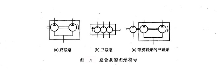 復(fù)合液壓泵的性能參數(shù)(如壓力、排量等)取決于相關(guān)單泵的參數(shù)。但作用于各單泵傳動軸和通軸上的最大轉(zhuǎn)矩不得高于它們允許的極限值,尤其必須考慮到作用于第一級驅(qū)動軸上的總轉(zhuǎn)矩是驅(qū)動其他幾級單泵的轉(zhuǎn)矩之和,如圖M所示。復(fù)合泵的液壓圖形符號與各泵間的油路連接方式有關(guān),圖N所示為三種復(fù)合泵的液壓圖形符號。