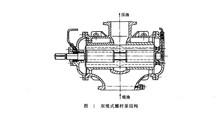 圖I所示為雙吸式螺桿泵結(jié)構(gòu)。為了使軸端便于密封并減小伸出端所引起的不平衡力,通常都是兩邊吸油中間排油,軸向力基本上得到平衡。未平衡的只是軸伸出端由于大氣壓力與吸入腔的壓差所引起的力。