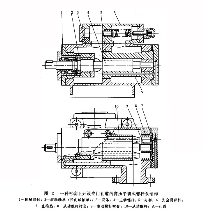 圖G所示為一種襯套上開設(shè)專門孔道的高壓平衡式三螺桿的螺桿泵結(jié)構(gòu)。外套上開設(shè)的專門孔道A將高壓腔的液體引入螺桿底部的平衡活塞處。主動螺桿4從高壓腔伸出,通過徑向球軸承2支承,以承受主動螺桿剩余軸向力和固定其位置。在主動螺桿高壓端設(shè)有直徑較大的臺肩,還采用了高壓止推軸承卸荷結(jié)構(gòu)。