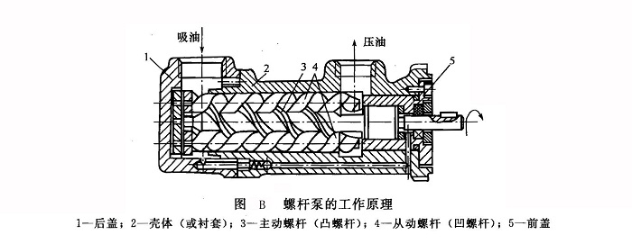 圖B所示為螺桿泵的工作原理,在殼體(或襯套)2中放有三根平行的雙頭螺桿,它們是螺桿泵的核心工作部件。中間的螺桿為兼作傳動(dòng)軸的凸螺桿3(即主動(dòng)螺桿),兩邊為兩根凹螺桿4(即從動(dòng)螺桿)。互相嚙合的三根螺桿與殼體之間形成密封工作容積。每個(gè)密封空間的長(zhǎng)度約等于螺桿的螺距。殼體左端油口為吸油口,右端油口為壓油口。當(dāng)凸螺桿由原動(dòng)機(jī)驅(qū)動(dòng)作順時(shí)針?lè)较颍◤妮S頭伸出端看)旋轉(zhuǎn)時(shí),螺桿泵從吸油口吸人液體,并容納于工作容積中,工作容積將沿軸向由螺桿的一端連續(xù)地向另一端移動(dòng),故液體也就由吸油口輸送到了壓油口,經(jīng)壓油口壓至液壓系統(tǒng),根據(jù)系統(tǒng)阻力大小建立起相應(yīng)的工作壓力。后續(xù)的螺旋面又不斷形成新的密封容積,隨著原動(dòng)機(jī)帶動(dòng)主動(dòng)螺桿連續(xù)旋轉(zhuǎn),上述過(guò)程即會(huì)周而復(fù)始地進(jìn)行下去。